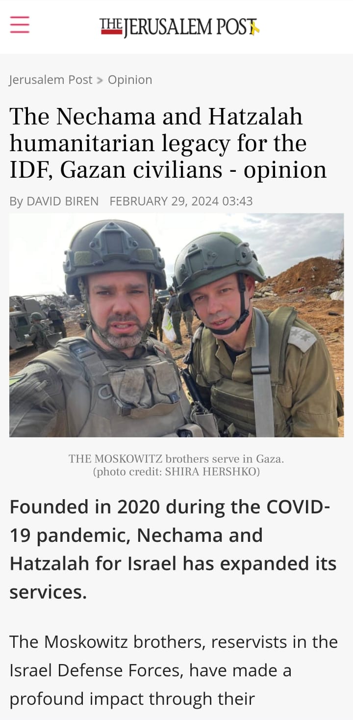 At the outbreak of the war, the Moskowitz brothers, who currently serve as in reserves units of IDF,. the Founders of 'NECHAMA AND HATZALA INC' in memory of Nechama Moskowitz RIP, established an operation center in Ramat Gan, with which they are raising many donations from Israel and abroad for the IDF and residents of the Gaza Strip and the North.